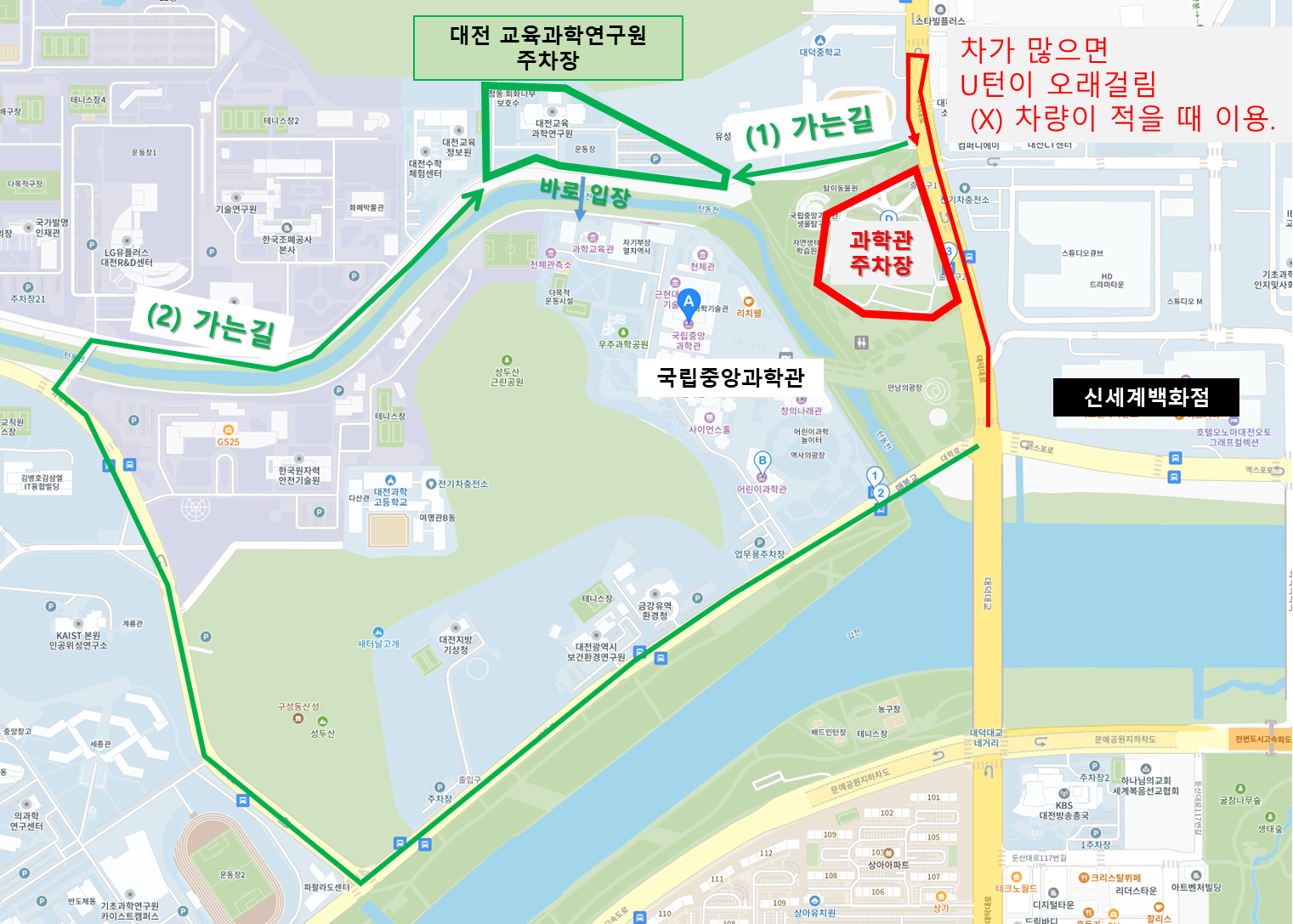 아래와 같이 국립중앙과학관 주차장이 아니고, 대전교육과학연구원 주차장에 주차를 하시면, 주차 후, 바로 입장이 가능합니다. 대부분의 시설이 무료 이용이기 때문에 매표소에 가야할 일이 적습니다.