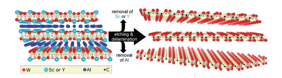 맥신의 평면 내 원자 배열.  에칭 프로세스와  박리를 통해 (오른쪽)  W1.33C MXene 을 만들 수 있음. (ref. Adv. Mater. 2018, 30, 1706409)