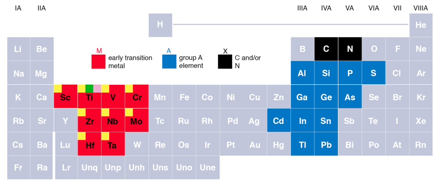 MAX의 다양한 구조는 아래와 같이 아주 다양한 원소로 구성된 맥신을 만드는 다양한 연구들이 진행되어 왔습니다.