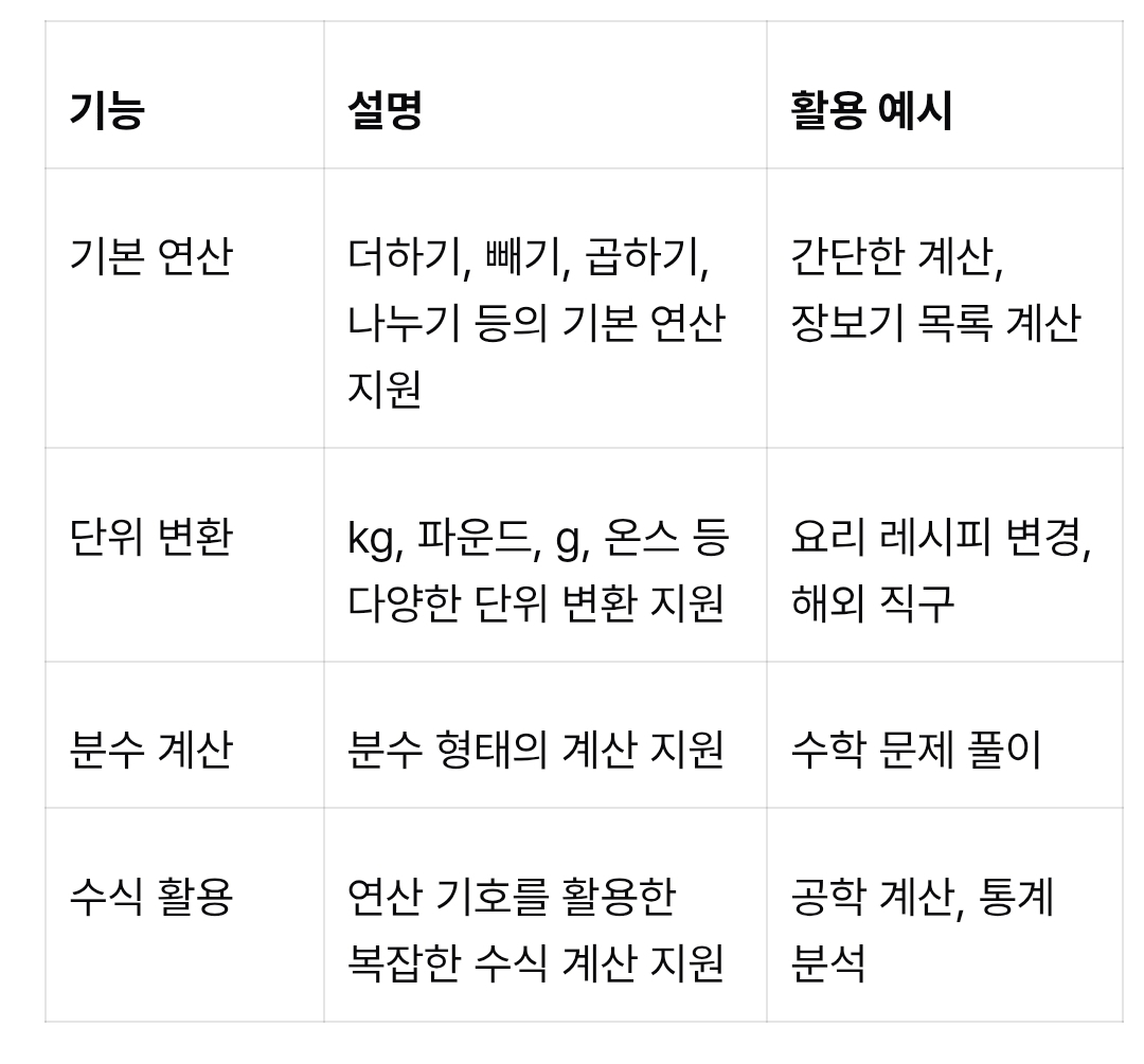 * 단위 변환: 요리 레시피를 변경하거나, 해외 직구 시 무게 단위를 변환하는 등 다양한 상황에서 단위 변환 기능을 활용할 수 있어요 .