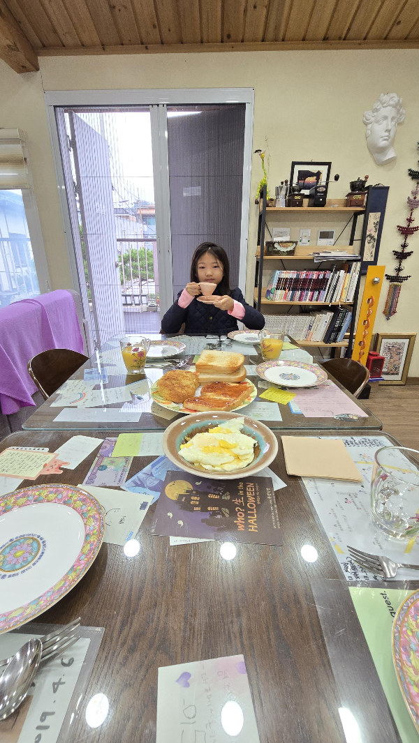 (아이들이 크니, 이런 것도 좋습니다. 셋이 알아서 첫째는 계란후라이, 둘째는 커피내리기 도전, 셋째의 빵 준비)
