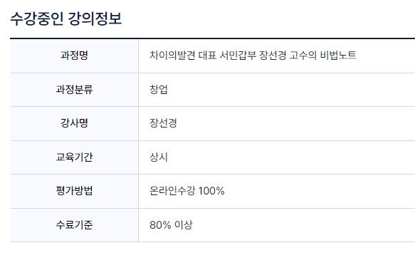 2. 나의 강의실에 들어가면 수강 중인 강의 정보가 나타납니다. 나의 과정과 평가방법 및 수료기준이 있습니다. 수료기준은 80%이상 동영상 시청을 하시면 수강 완료가 됩니다.