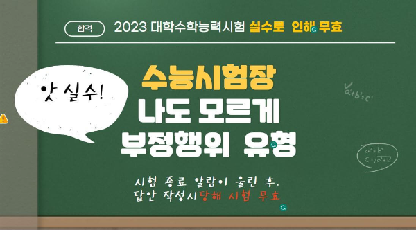 수능장에서는 하면 안 되는 실수들 알려드릴께요. 시험시 감독관의 판단하에 부정행위를 지적할 수 있으니, 시험 중에는 이상한 행동을 하지 않아야 합니다. 그리고 실수로 시험 중 소지하면 안되는 물건을 다른 곳에 놓더라도 적발 될 수 있습니다. 작은 실수가 시험에 영향을 주니 꼭 읽어보고 가세요.
