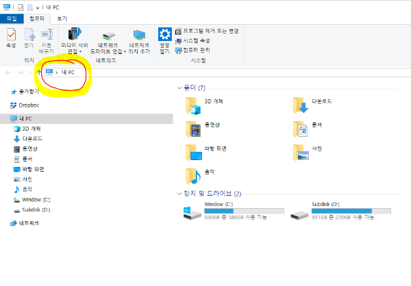 1. 파일 탐색기를 열고, '내PC' 라고 써 있는 주소창의 위치를 전체 선택합니다.