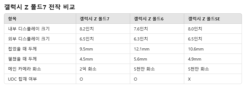 또한 내부 메인 디스플레이에는 폴드 SE에서 생략된 UDC(언더 디스플레이 카메라)가 다시 탑재되어 화면의 몰입감을 더욱 높일 것으로 기대됩니다.