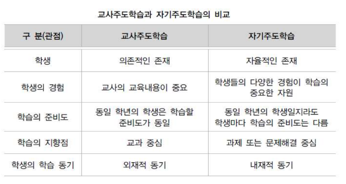 따라서, 자기주도학습의 개념을 보다 명확히 이해하기 위하여 교사 주도학습과의 차이점을 중심으로 설명하면 다음과 같습니다.