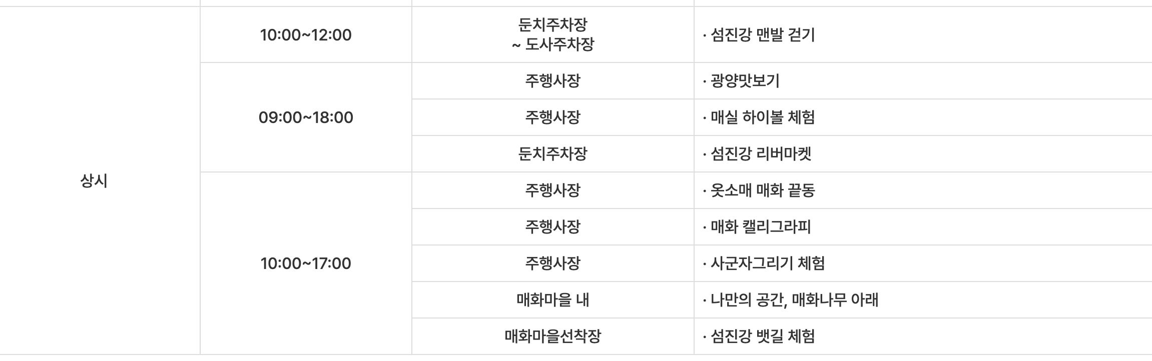 - 주차장 위치: 둔치주차장(일반차량), 도사주차장(대형버스, 섬진교 방면), 섬진주차장(대형버스, 남도대교 방면)