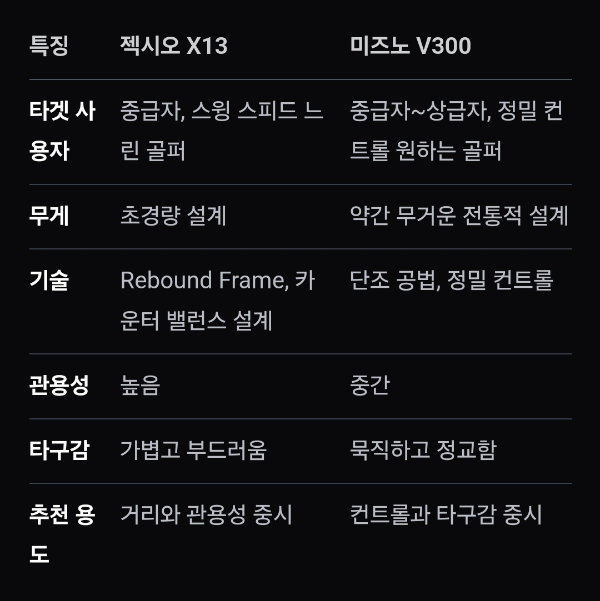 젝시오 X13과 미즈노 V300 아이언을 비교하면, 두 모델은 서로 다른 골퍼의 요구를 충족시키기 위해 설계된 클럽으로, 주요 차이점은 타겟 사용자, 기술적 특징, 그리고 성능에서 나타납니다. 아래는 두 모델의 주요 특징과 차이를 정리한 내용입니다.