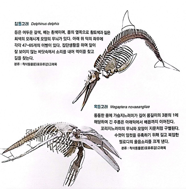 고래의 조상은 약 오천만년 전 바다와 가까운 육지에 살았어요. 그런데 고래의 조상이 먹이가 풍부하고 공간이 넓은 바다로 옮기가 살면서 앞다리는 지느러미 형태로 바뀌었어요.  그리고 뒷다리는 퇴화되면서 몸은 유선형이 되고, 꼬리는 위 아래로 움직이며 헤엄을 칠 수 있게 되었어요. 이처럼 고래는 물속 생활엔 가장 잘 적응한 포유류로  이빨이 없어 위턱에 수염판이 촙촘하게 박힌 수염고래와 이빨이 있는 이빨고래로 나뉘어요