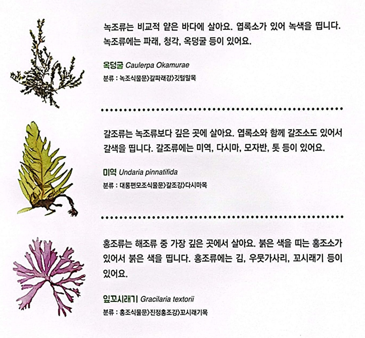 녹조류 : 녹조류는 비교적 얕은 바다에 살아요. 엽록소가 있어 녹색을 댑니다. 녹조류에는 파래, 청각, 옥덩굴 등이 있어요.