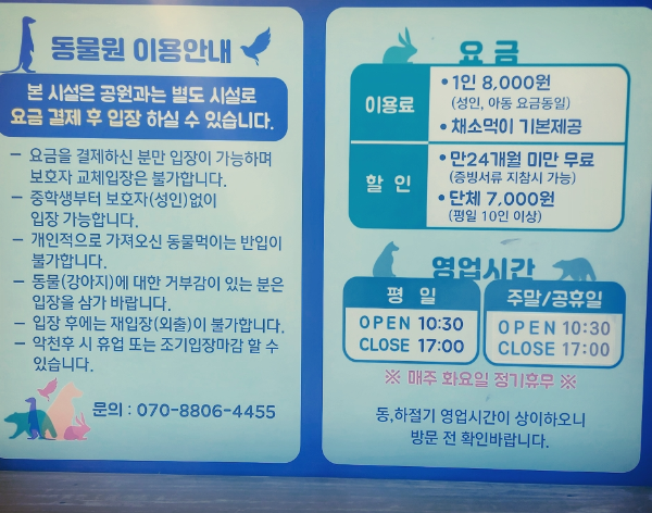 이용료는 성인과 아동 모두 1인당 8,000원으로, 동물원 방문이 가족 단위의 여행객들에게도 부담 없는 가격입니다. 특히, 만 24개월 미만의 어린이는 무료로 입장할 수 있으며, 단체 방문객(평일 10인 이상)의 경우에는 1인당 7,000원의 할인된 가격으로 이용할 수 있습니다. 동물원은 주말과 공휴일에도 오전 10시 30분에 문을 열고 오후 5시에 문을 닫으며, 매주 화요일은 정기 휴무일입니다. 방문 전에는 계절에 따라 영업 시간이 변동될 수 있으니 확인하는 것이 좋습니다.