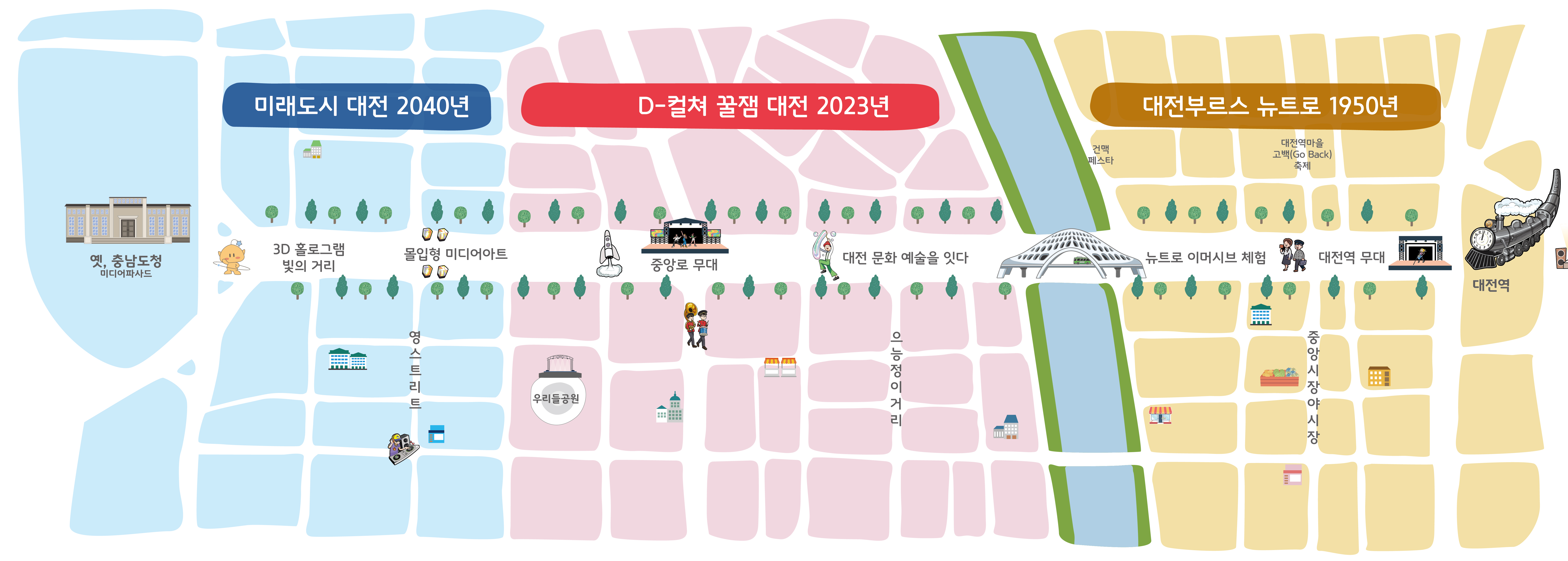 누구든 대전의 매력을 한눈에 알아볼 수 있는 세 가지 주요 존을 소개하려 합니다. 각각 과거, 현재 그리고 미래 존이라 불리우는 이 곳들은 대전의 시간 여행을 가능케 하며, 다양한 체험과 문화 행사를 통해 관광객들에게 잊지 못할 추억을 선사합니다.