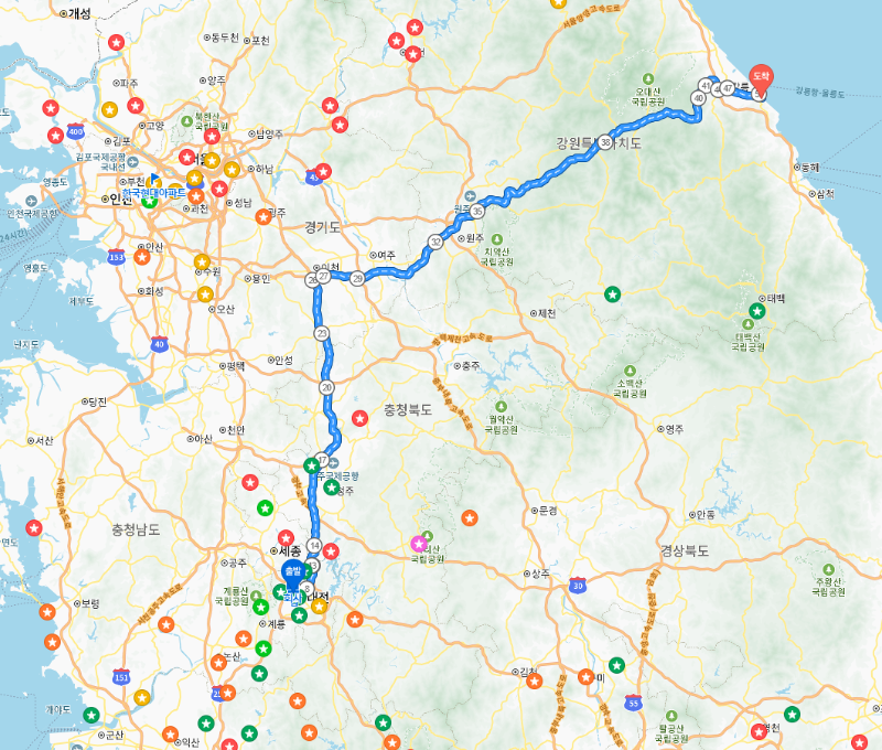 다섯 식구가 묵을 첫 번째 숙소는 "임해자연휴양림"입니다. (대전에서 289 km, 3시간 17분)