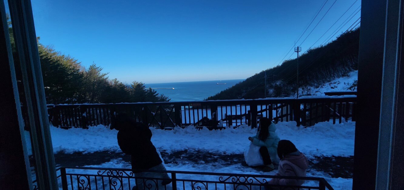 일단 차를 타고 올라가는 길에서 오션뷰를 보면 아래 사진과 같습니다. 우리 가족이 여행을 가기 2-3일 전에 눈이 많이와서 걱정을 했지만, 가파른 길이지만, 눈 정리는 잘 되어 있었습니다. 걱정하지 않아도 될 듯 합니다. 하지만 최고 위에 있는 하늘동은 눈이 많이 오면 아예 예약이 불가하다고 하니 참고하시기 바랍니다.