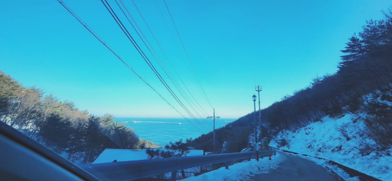일단 차를 타고 올라가는 길에서 오션뷰를 보면 아래 사진과 같습니다. 우리 가족이 여행을 가기 2-3일 전에 눈이 많이와서 걱정을 했지만, 가파른 길이지만, 눈 정리는 잘 되어 있었습니다. 걱정하지 않아도 될 듯 합니다. 하지만 최고 위에 있는 하늘동은 눈이 많이 오면 아예 예약이 불가하다고 하니 참고하시기 바랍니다.