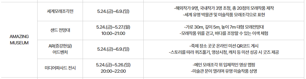 올해 해운대 모래축제는 여러분에게 잊지 못할 추억을 선사할 것입니다. 가족, 친구, 연인과 함께 아름다운 해운대 해변에서 모래 예술을 감상하고, 다양한 체험 프로그램을 즐겨보세요. 5월의 해운대는 여러분을 기다리고 있습니다!