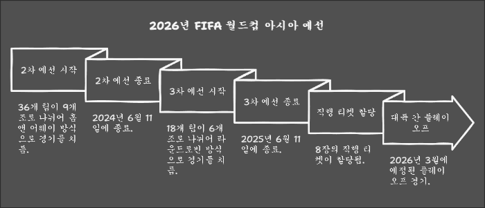 2026년 월드컵은 사상 처음으로 48개 팀이 본선에 진출하며, 북미 3개국(미국, 캐나다, 멕시코)이 공동 개최합니다. 개최국 3개국은 자동으로 본선에 진출합니다.
