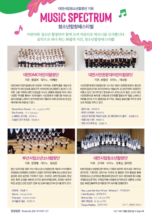 대전시립청소년합창단이 주최하고 주관하는 **MUSIC SPECTRUM 청소년합창페스티벌**에 대한 정보입니다. 다양한 청소년 합창단이 참여하는 이 행사는 합창 음악의 아름다움과 다양성을 선보일 예정입니다. 아래는 행사에 대한 주요 정보입니다: